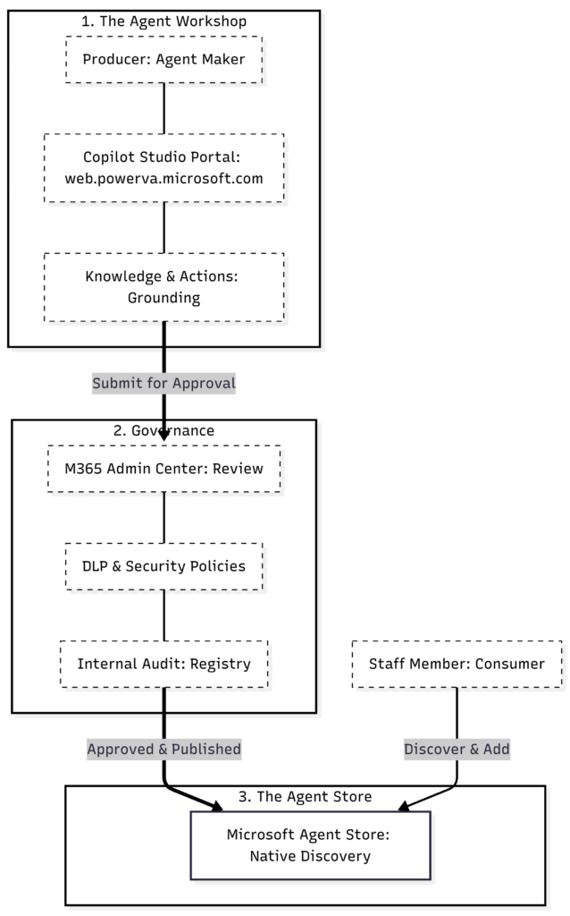 The governance phase takes place within the m365 admin center where administrators evaluate the submission against existing data loss prevention and security policies. During this time the agent is also documented in an internal audit registry to ensure transparency and compliance. Following a successful review the agent is officially approved and published.